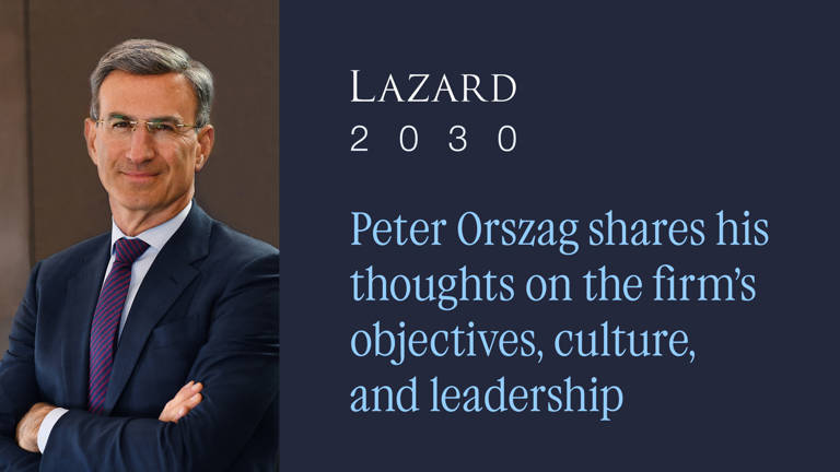 In September 2025, Lazard CEO and Chairman Peter Orszag shared an update on the firm's 2030 vision. Building upon two years of meaningful progress in revitalizing the firm's culture and achieving exceptional outcomes for clients and shareholders, Lazard remains focused on measuring future success across three key dimensions: relevance, revenue, and returns, while leveraging transformative technologies such as artificial intelligence (AI).