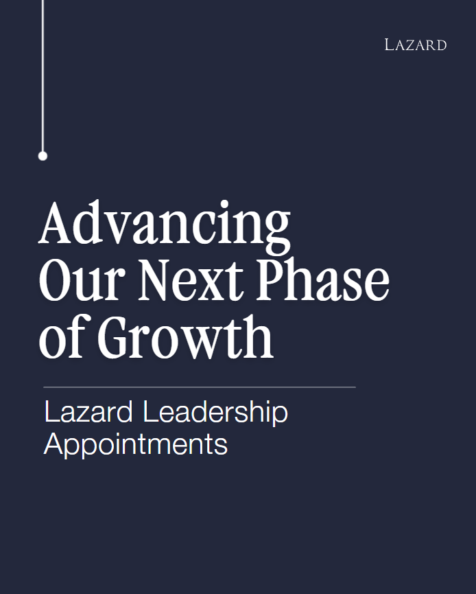 Founded in 1848, Lazard is the preeminent financial advisory and asset management firm, with operations in North and South America, Europe, the Middle East, Asia, and Australia. Lazard provides advice on mergers and acquisitions, capital markets and capital solutions, restructuring and liability management, geopolitics, and other strategic matters, as well as asset management and investment solutions to institutions, corporations, governments, partnerships, family offices, and high net worth individuals. For more information, please visit Lazard.com and follow Lazard on LinkedIn.