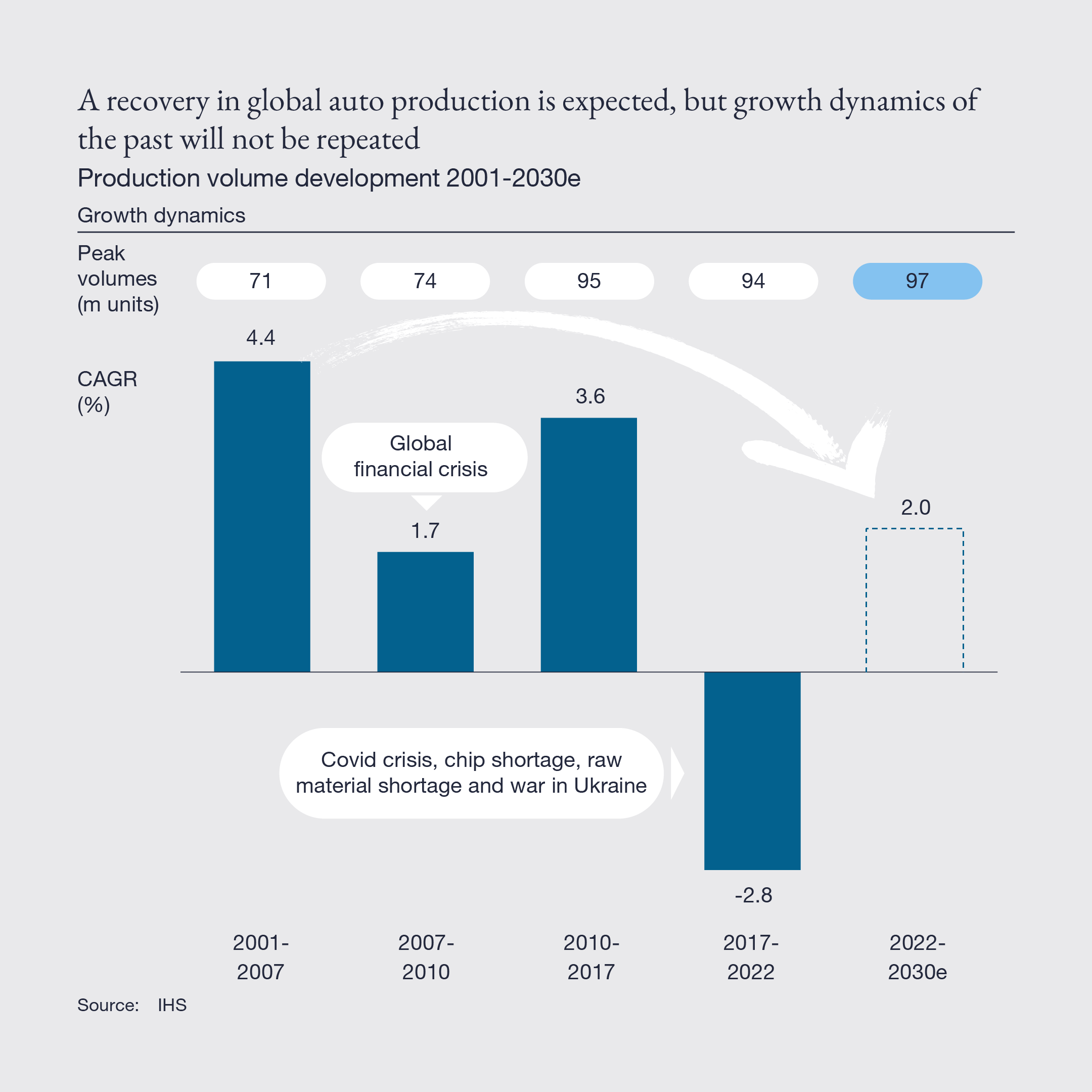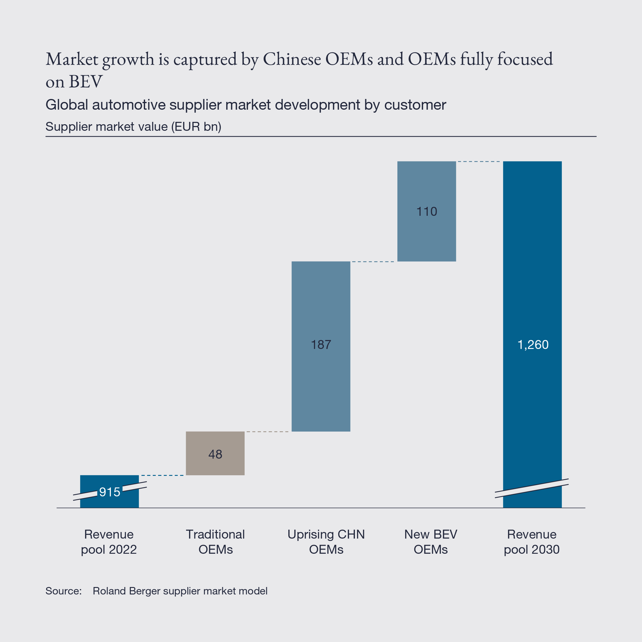 - The automotive supplier industry is projected to grow by 4% per annum until 2030, with cumulative growth of 30%, and reaching a total value of nearly USD $1.3 trillion – with growth coming primarily from Asia.
