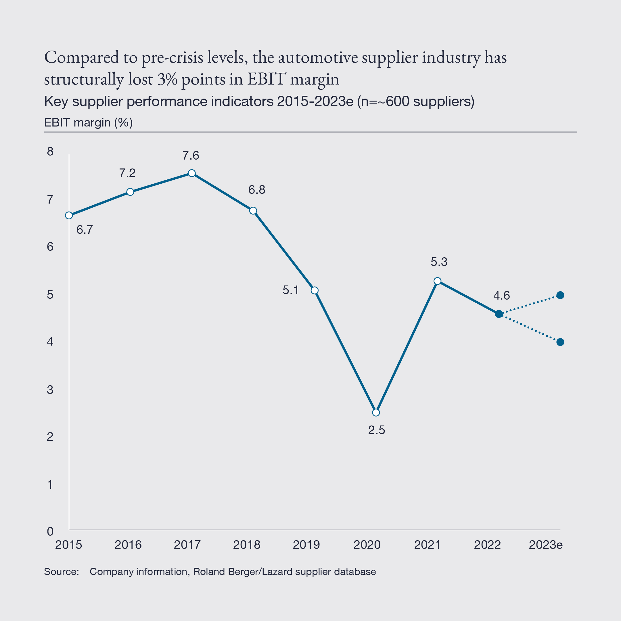 The second group is made up of the traditional automotive suppliers, who still enjoyed healthy results in 2017 and 2018, but have structurally lost three percentage points of EBIT margin in the years since, with a margin level of just 4.6% in 2022.