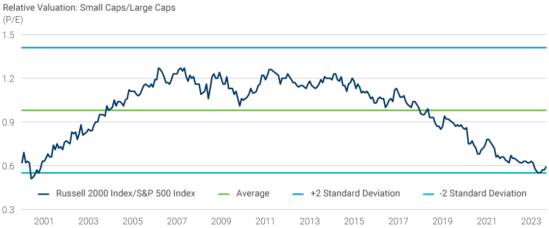 Lastly, the valuation differential between small- and large-cap stocks has reached extreme levels. Since 2000, the trailing 12-month P/E ratio for positive earners in the Russell 2000 Index has averaged 98% of the comparable multiple for the S&P 500 Index. The lowest relative valuation was in June 2000 when the Russell 2000 P/E ratio was at 51% of the S&P 500 Index. As of 30 September 2023, the ratio stood at 59% after reaching 55% in May and June of 2023. Considering the factors noted above and relative valuation, we believe the opportunity in U.S. small-cap investing appears compelling.