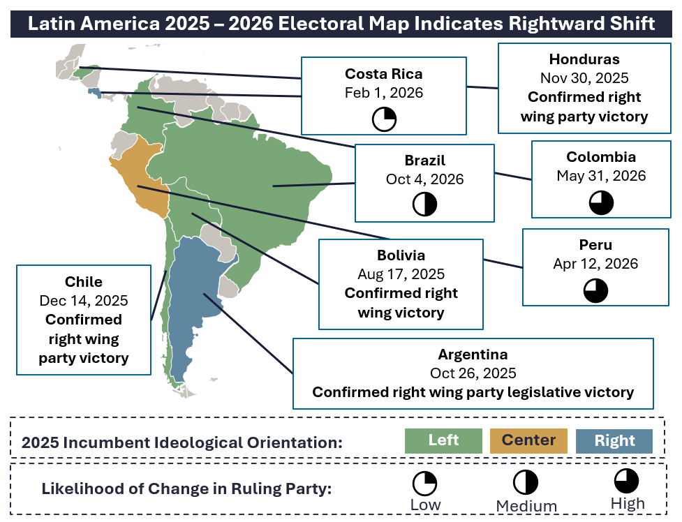 Against the backdrop of growing US assertiveness, a crowded electoral calendar will also play a decisive role in the region’s outlook. Disappointing economic results under left‑leaning incumbents is creating momentum for right‑wing candidates after a long period of left‑of‑center dominance. This ideological shift is likely to bring more market‑friendly policies, including lighter regulation, business friendly reforms, and efforts to address deteriorating security conditions.
