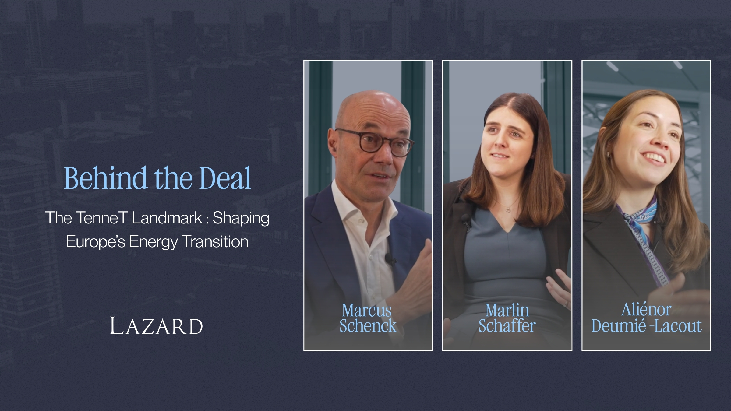 The video highlights the collaborative efforts of Lazard teams in Frankfurt, Munich, Amsterdam and Paris, who worked seamlessly across offices to support TenneT Holding. Their work illustrates how thorough analysis, disciplined execution and cross‑border coordination are essential when advising on transactions that sit at the intersection of infrastructure, energy policy and capital markets.