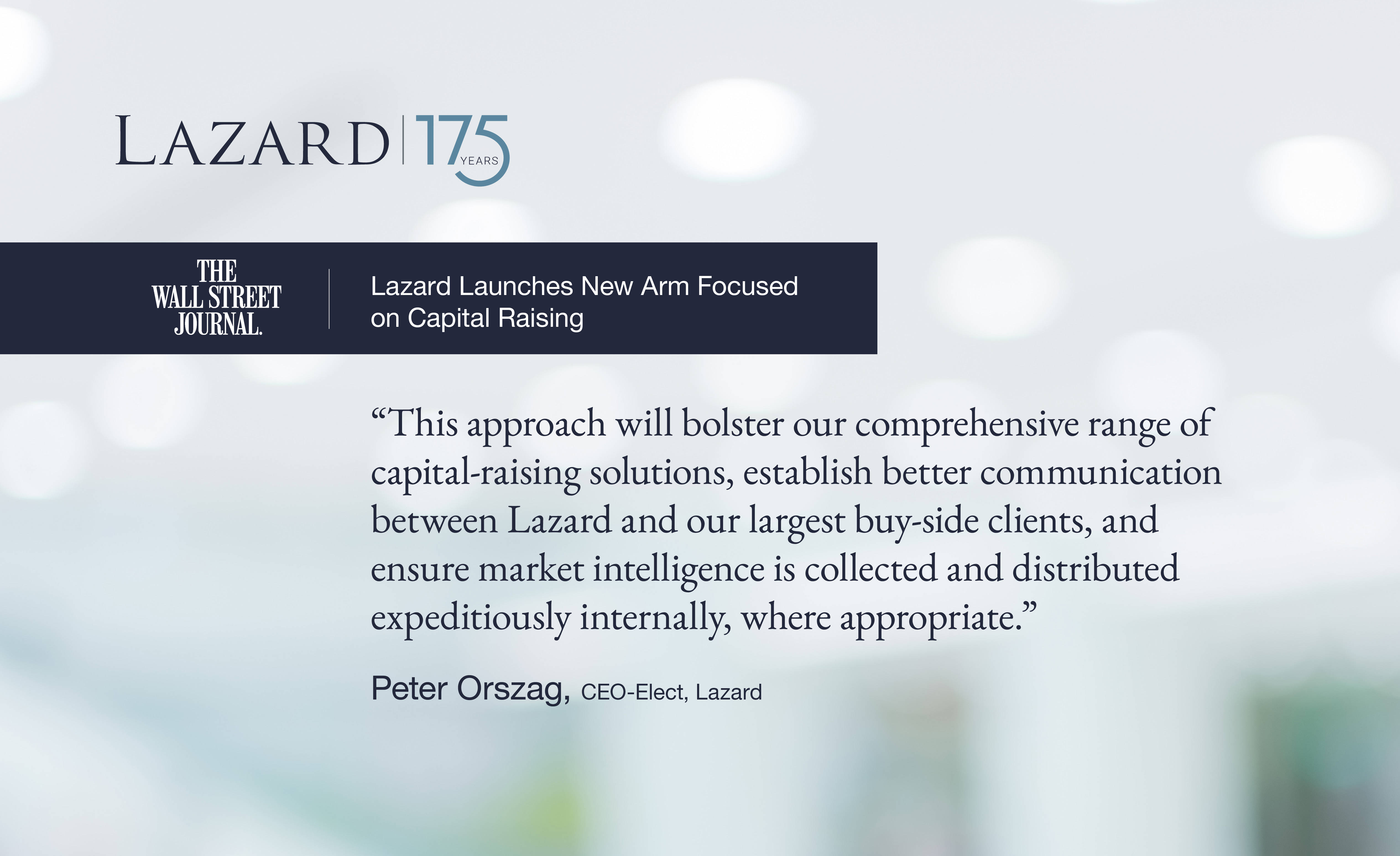 The piece goes on quote Peter Orszag, Chief Executive Officer of Financial Advisory, who observes: "This approach will bolster our comprehensive range of capital-raising solutions, establish better communication between Lazard and our largest buy-side clients, and ensure market intelligence is collected and distributed expeditiously internally, where appropriate."