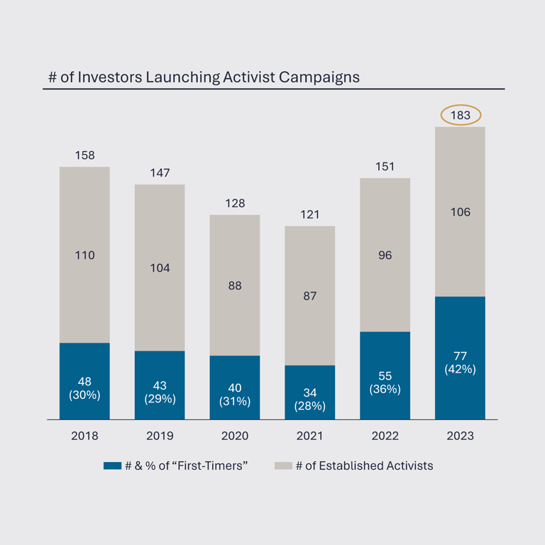 - A record 77 first timers initiated campaigns in 2023 vs. 55 first timers in 2022 and above the five-year average of 44