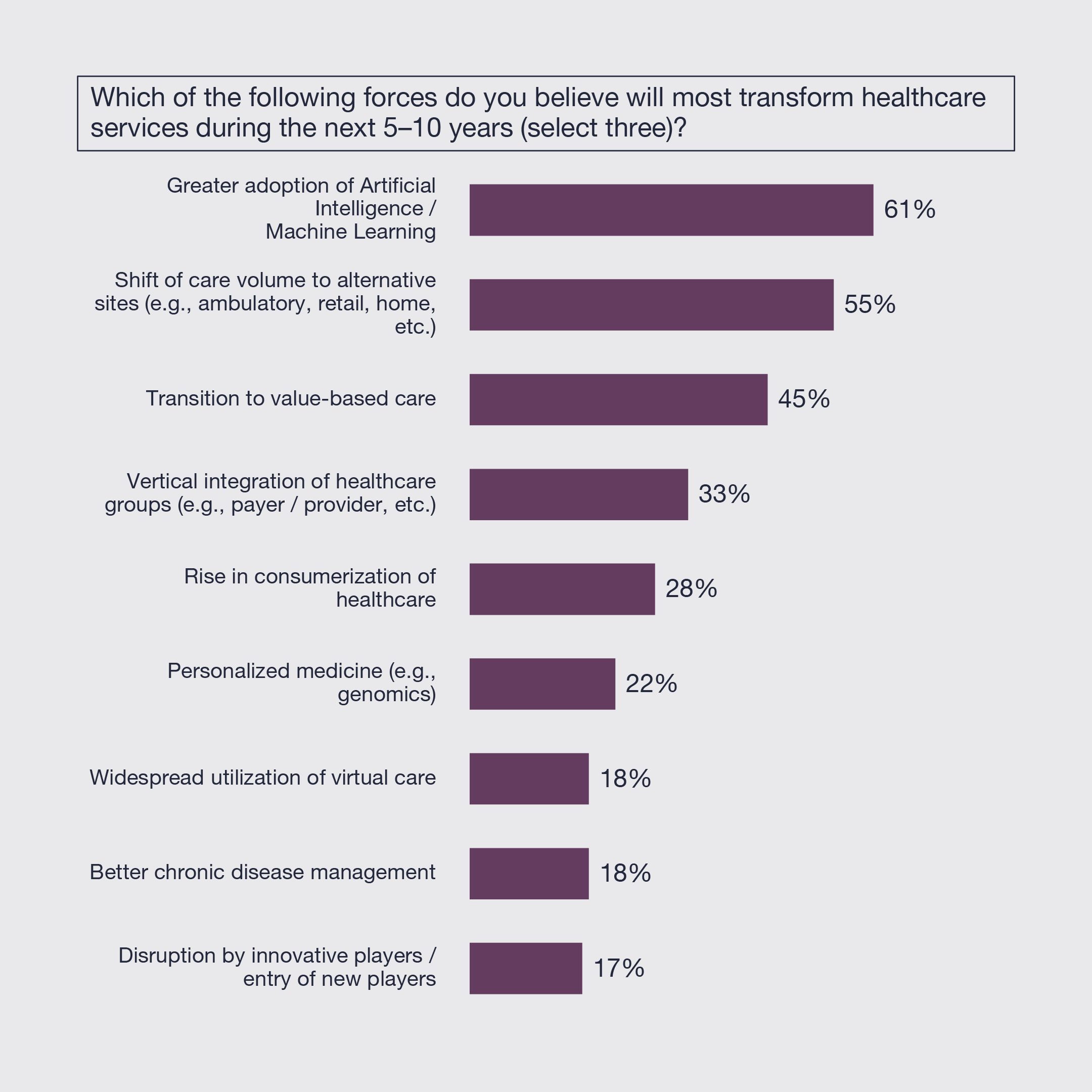 4. Greater adoption of artificial intelligence / machine learning (“AI/ML”) is the force expected to most transform healthcare services over the next decade, followed by the shift of care volume to alternative sites and the transition to value-based care. AI/ML is expected to drive the most improvement in areas such as clinical decision support, revenue cycle management and administration / operations.