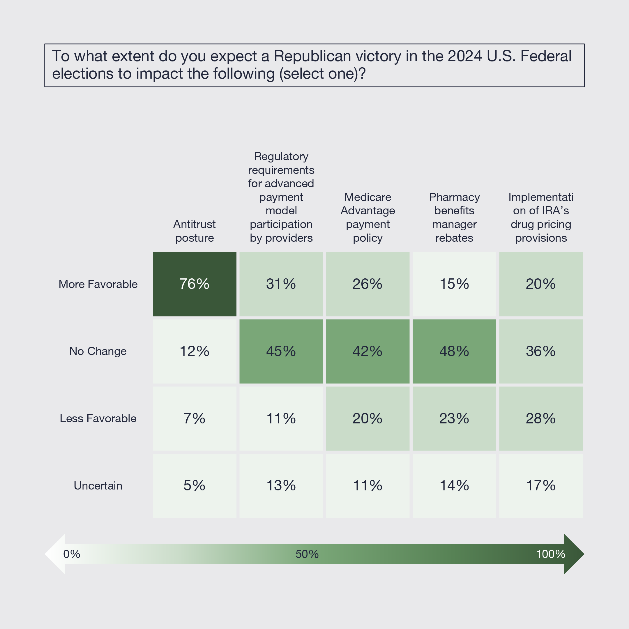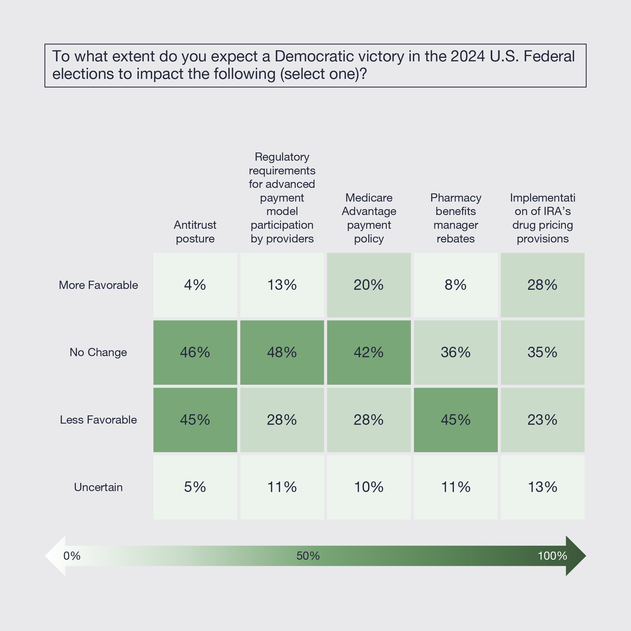 5. Healthcare services leaders believe that a Republican victory in the 2024 U.S. Federal elections would lead to a more dovish antitrust environment and that a Democratic victory would lead to lower rebates for pharmacy benefits managers (“PBMs”). On the other hand, they do not believe the outcome of the elections will have a meaningful impact on value-based payment model participation, Medicare Advantage payments or the implementation of the drug pricing provisions of the Inflation Reduction Act (“IRA”).