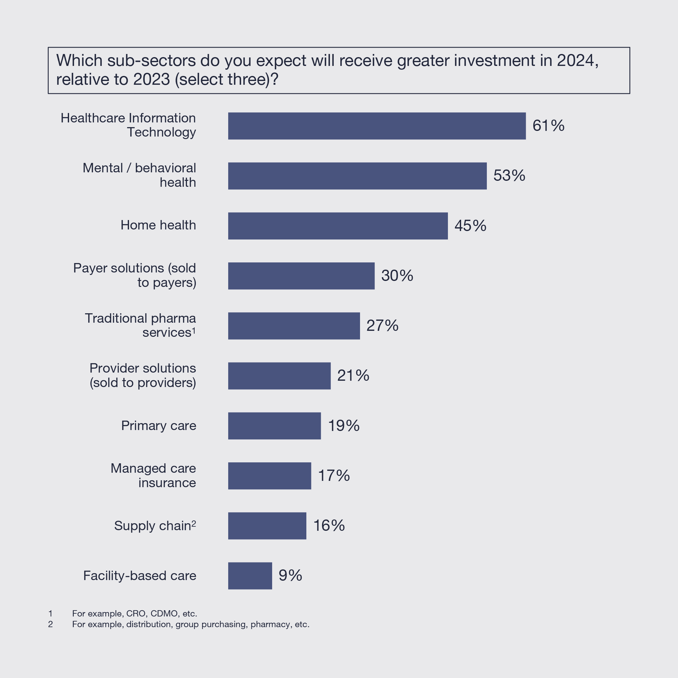 3. Healthcare IT (“HCIT”), mental / behavioral health and home health are expected to receive greater investment in 2024 than in 2023, followed by payer solutions and pharma services. Respondents believe that facility-based care and supply chain are the areas least likely to receive greater investment in 2024.