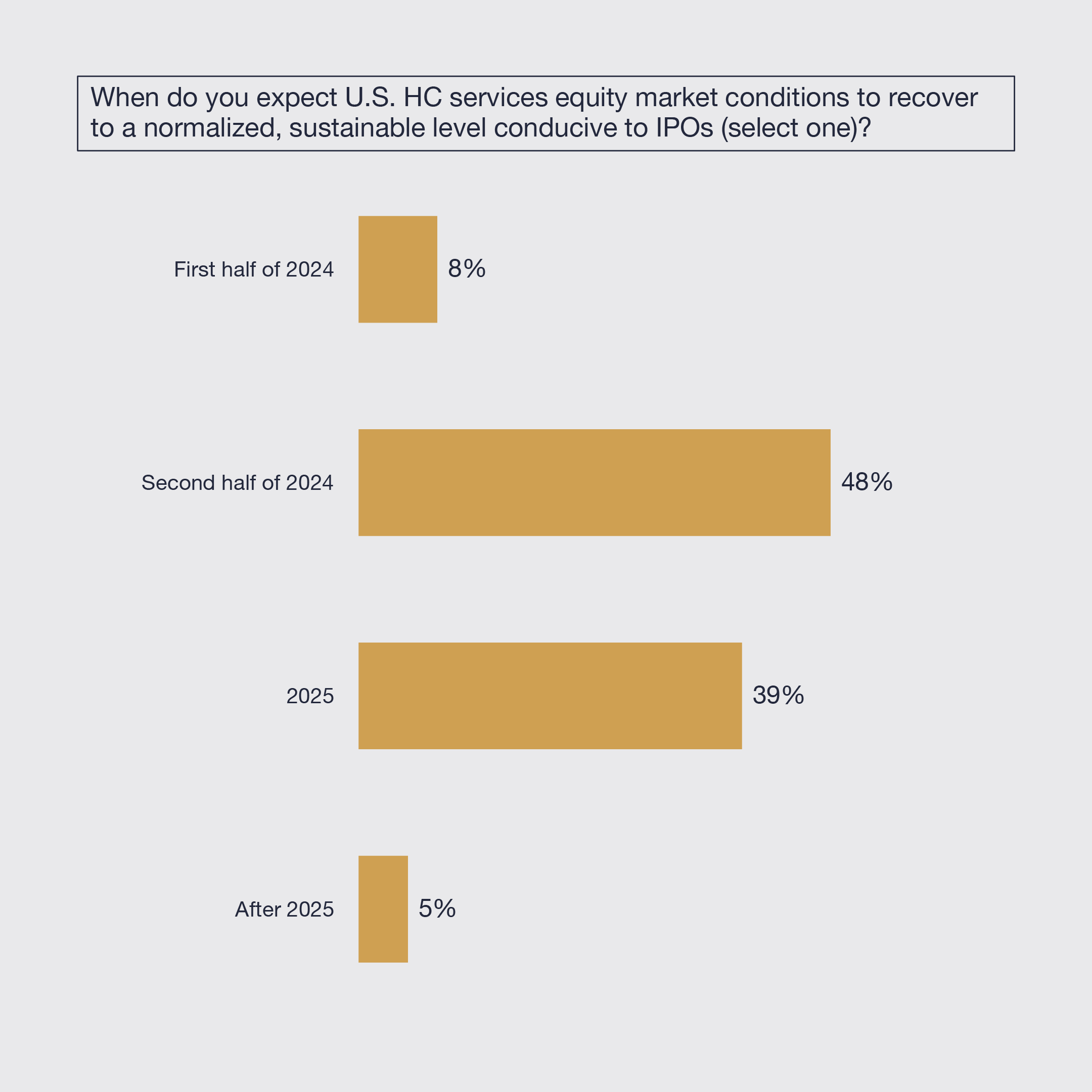 1. Healthcare services equity market conditions are not expected to recover to normalized, sustainable levels conducive to IPOs before the second half of 2024 or 2025. An improved macroeconomic outlook, greater access to capital and improved investor sentiment toward sector profitability are the factors expected to catalyze a market recovery.