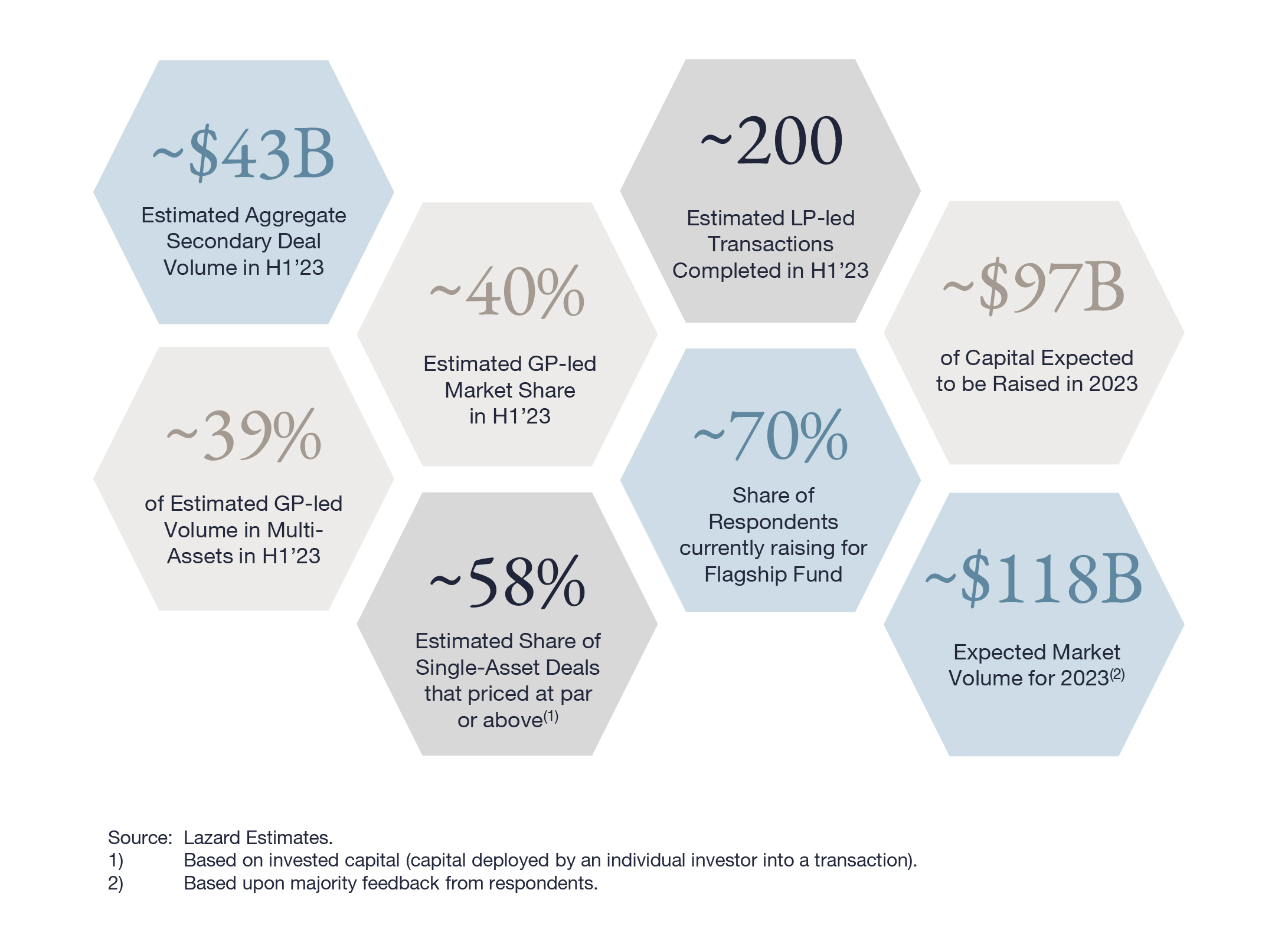 - LP-led activity formed approximately 60% of the secondary market in the first half of 2023, driven by overallocation issues among several large North American LPs and ongoing secondary buyer interest in diversified portfolios