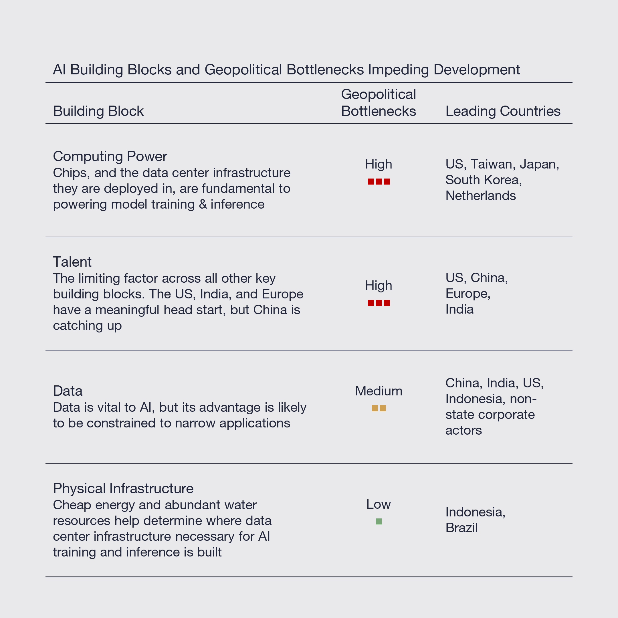 National-level policies and their impact on the global scramble for AI depend in part on the distribution of structural advantages necessary to power AI development. Computing power, talent, data, and physical infrastructure are widely recognized as the key building blocks for AI development and adoption. So far, the US has most prominently deployed its strength in computing power. Yet, the other three factors will also increasingly be weaponized in the AI race.