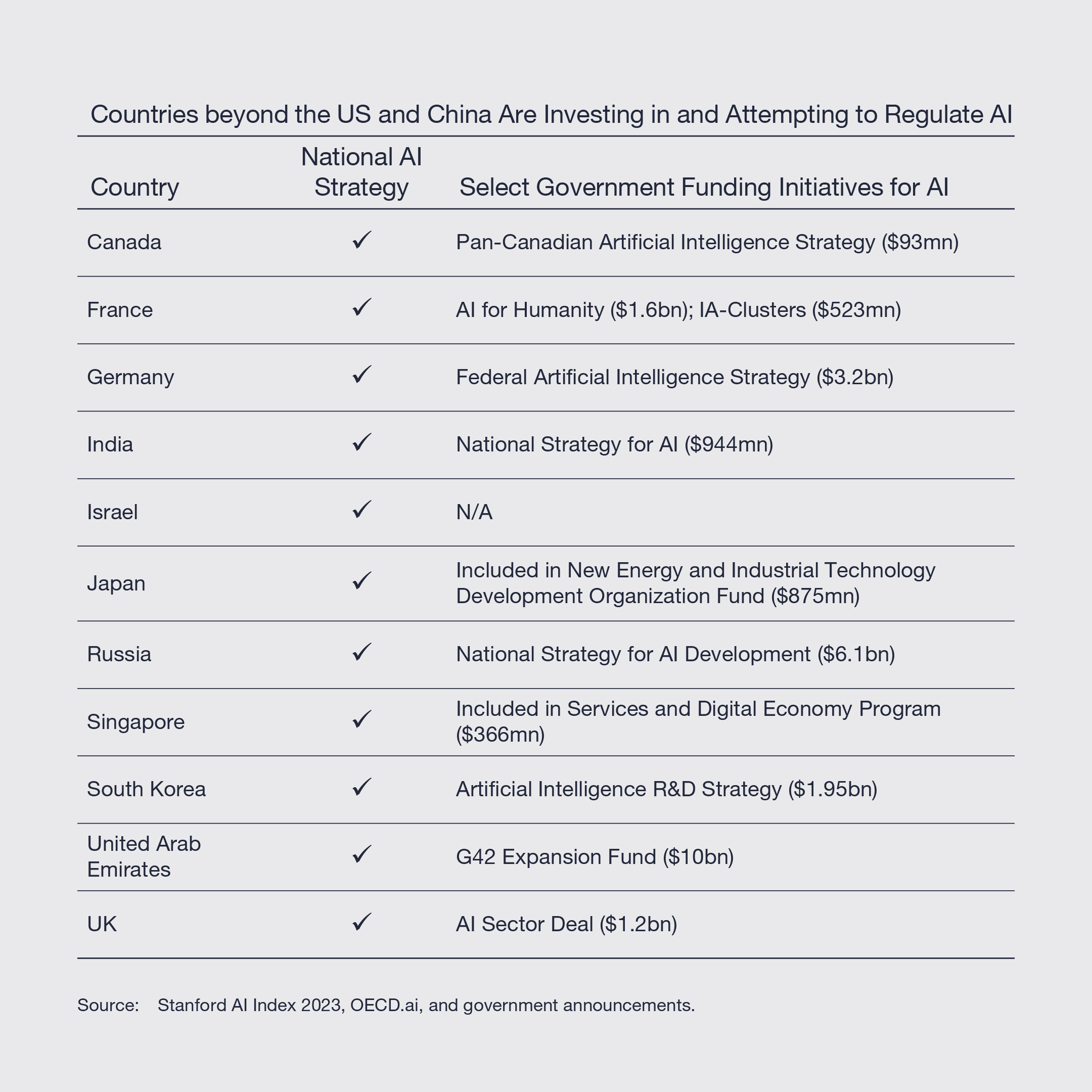 - As U.S. and Chinese companies are increasingly restricted from buying and selling to one another, third countries that are either well positioned to support AI development or primed for AI adoption could provide opportunities for expansion. It is worth looking beyond the U.S. and China to assess which other countries will have advantages across each of the AI bottlenecks.